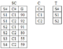 47. 学生选课成绩表的关系模式是SC(S#,C#,G),其中S#为学号,C#为客号,G为成绩,关系T=πS#,C#(SC)/C表示______。 A. 选修了表C中全部课程的学生学号B. 全部学生的学号C. 选修了课程C1或C2的学生学号D. 所选课程成绩及格的学生学号